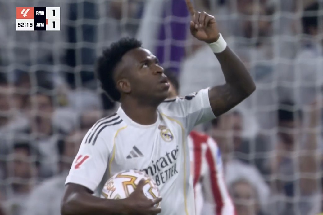 此役主场对阵马德里竞技,首发出战的维尼修斯在比赛第52分钟罚入由卜拉欣-迪亚斯制造的点球,帮助皇家马德里1-1扳平比分。