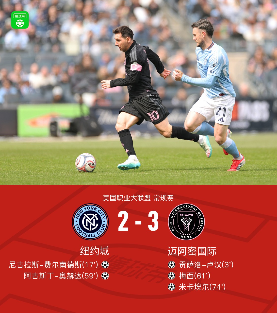 北京时间3月23日美国职业大联盟 常规赛,纽约城主场对阵迈阿密国际。纽约城尼古拉斯-费尔南德斯破门,阿古斯丁-奥赫达破门。迈阿密国际贡萨洛-卢汉破门,梅西破门,米卡埃尔破门。最终比分纽约城 2–3 迈阿密国际。