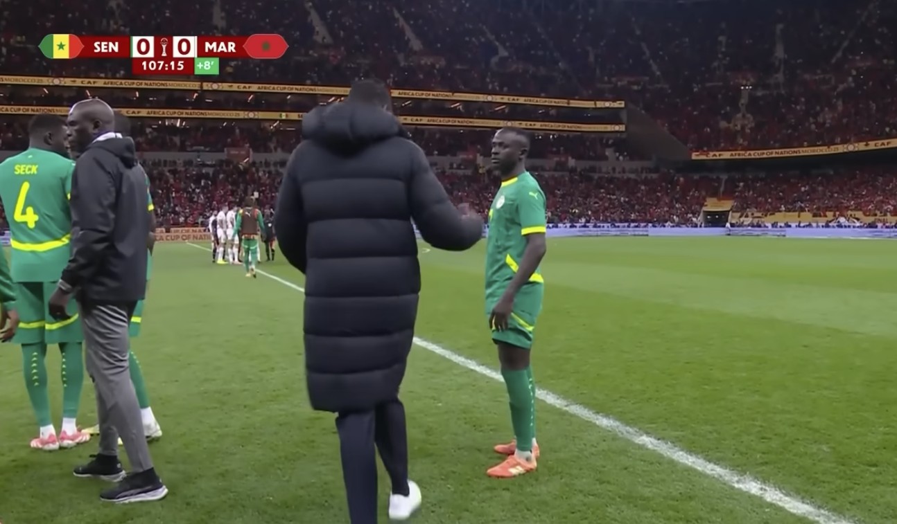 1月18日,摩洛哥首都拉巴特。非洲杯决赛进行到伤停补时阶段,第92分钟塞内加尔打进一球,因犯规在先被判无效;第95分钟,卜拉欣-迪亚斯禁区内被拽倒,裁判观看VAR回放后判罚点球。这引发了塞内加尔将帅的强烈不满,在与比赛官员和摩洛哥球员争执超过3分钟之后,塞内加尔主帅蒂奥于第102分钟招呼球员们返回更衣室。比赛因此中断15分钟。