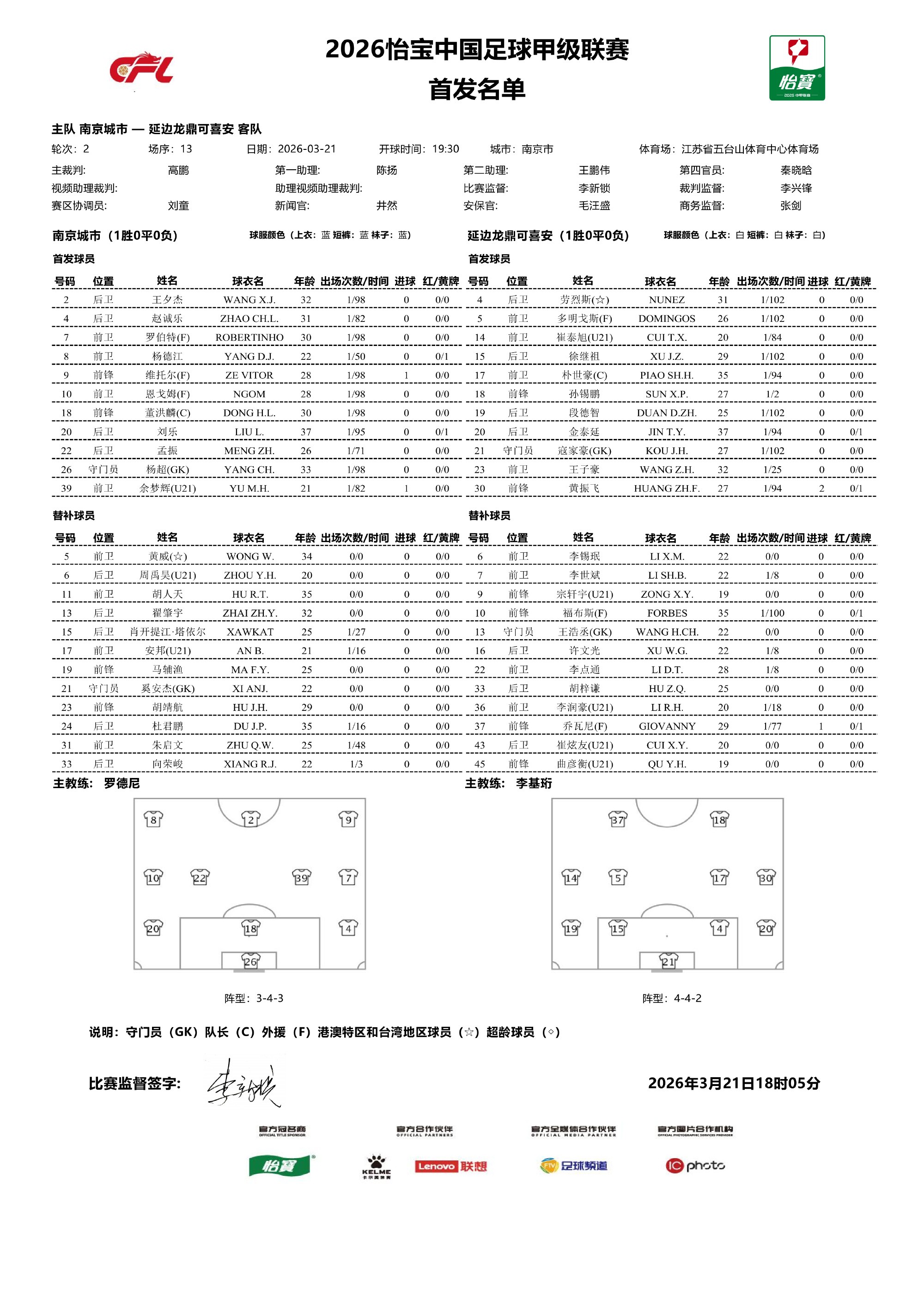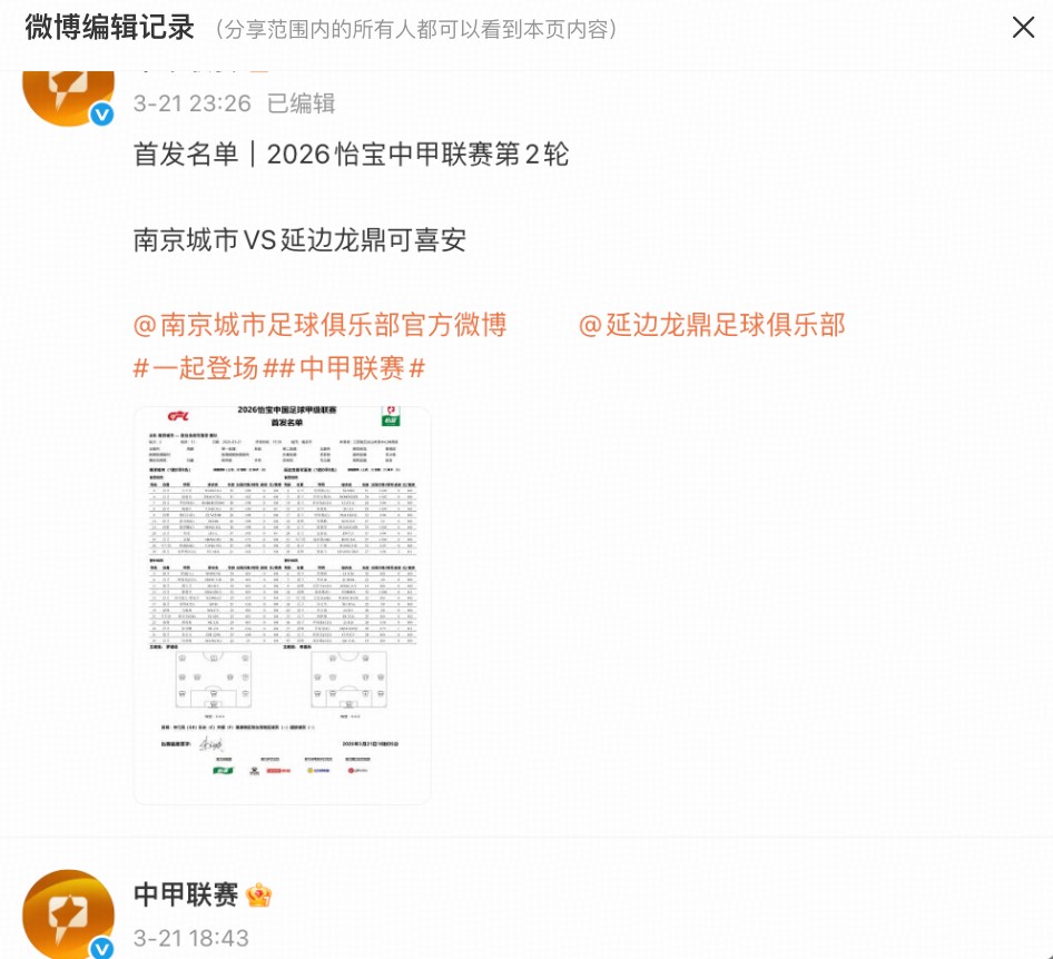 南京城市与延边龙鼎的比赛在3月21日进行,中甲联赛官方微博赛前发布的首发名单中,延边外援乔瓦尼是在其中的,但更新后他的名字出现在了替补席,首发的是王子豪。