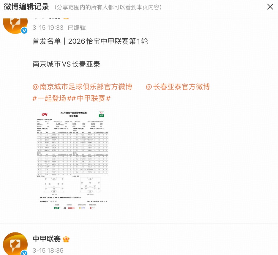 首轮南京城市与长春亚泰的比赛也出现了类似情况,赛前版本的首发名单中是有长春亚泰外援赖纳的,但更新后他的位置被陈国良替代,赖纳甚至没有进入替补名单,这与乔瓦尼从首发变为替补不同。