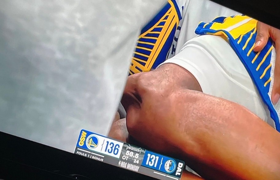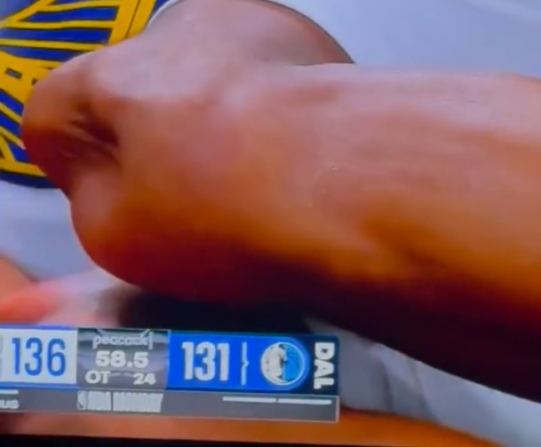比赛进行到加时赛还剩1分钟时,勇士后卫穆迪抢断欲完成扣篮,但脚下打滑,在空中失去平衡摔倒在地,随后穆迪捂着自己的膝盖。