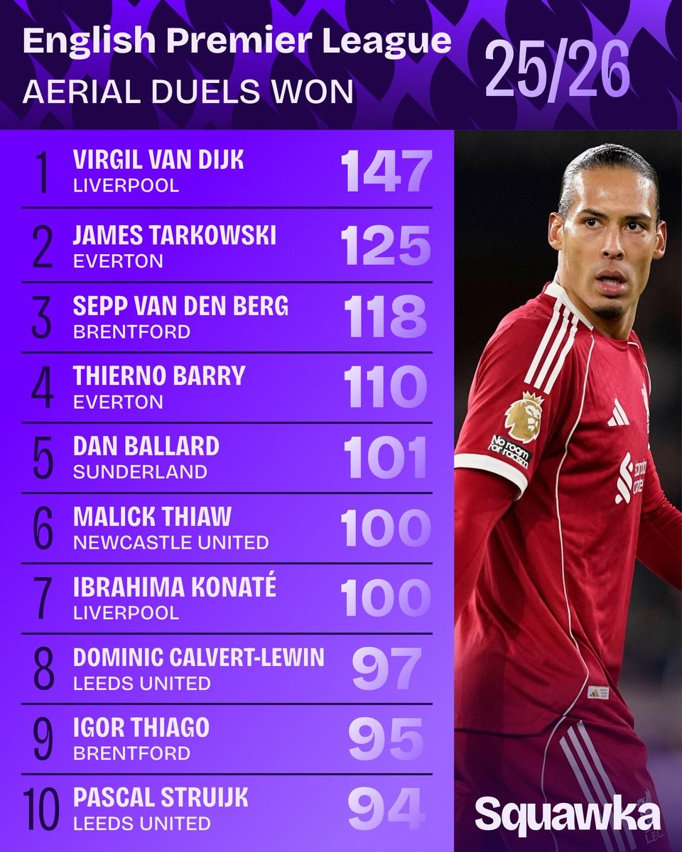 北京时间3月24日,知名数据机构Squawka统计出了本赛季至今英超成功争顶次数最多的10名球员,范戴克147次断档领先,塔尔科夫斯基125次第2,马利克-佳夫和科纳特上榜。
