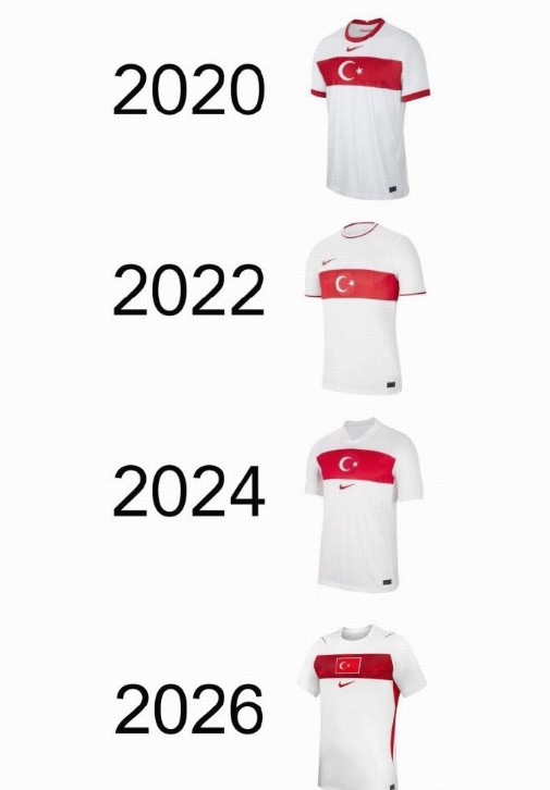 下图通过对比,进一步凸显了土耳其球衣设计的趋同性。