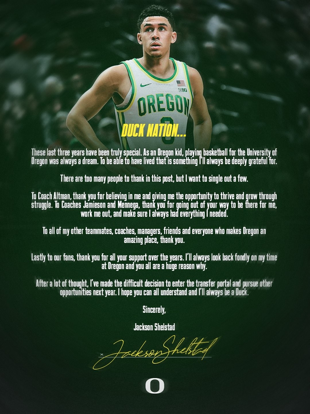 北京时间3月25日,俄勒冈大学后卫谢尔斯塔德在个人社媒宣布自己将申请转校。