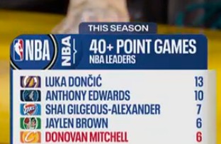 赛后根据统计,本场比赛的42分是米切尔本赛季第6次单场得分40+,同期这一数据排在联盟所有球员的第4位,与杰伦-布朗并列,仅次于东契奇(13次)、安东尼-爱德华兹(10次)以及亚历山大(7次)。