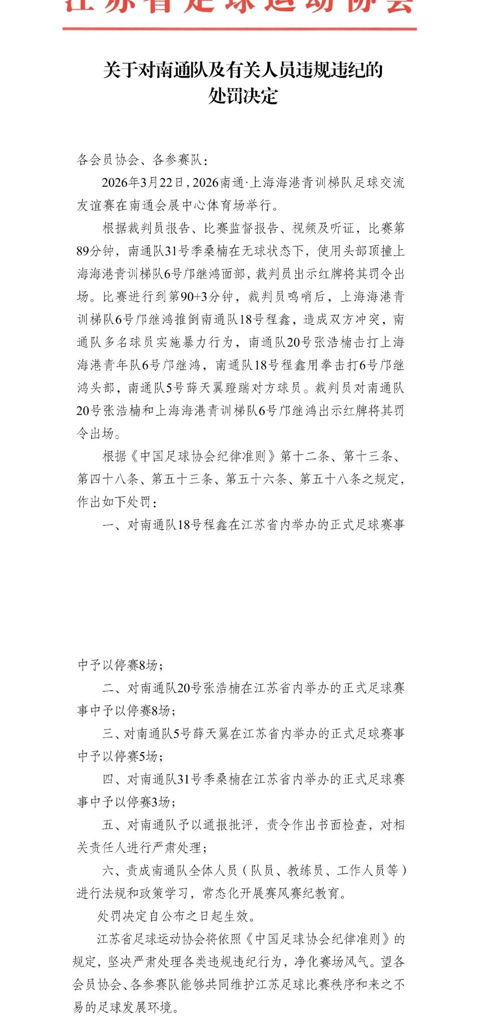 江苏足协处罚南通队员,停赛5-8场,铁路警察,各管一段。中国足协没亲自出面,由地方足协负责处罚。