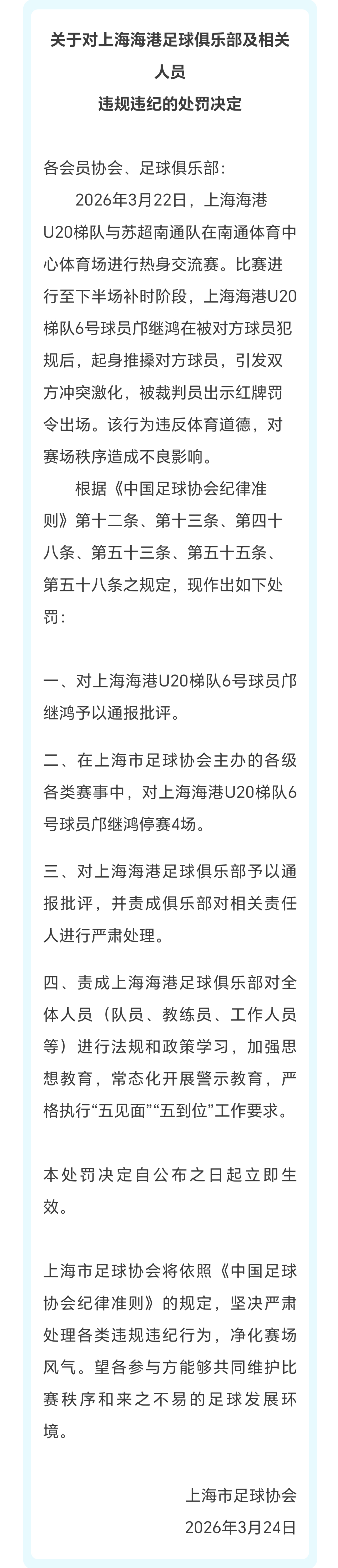 苏超南通队对海港U-20队热身赛打架的事,上海足协出面处罚了海港小球员,停赛4场!
