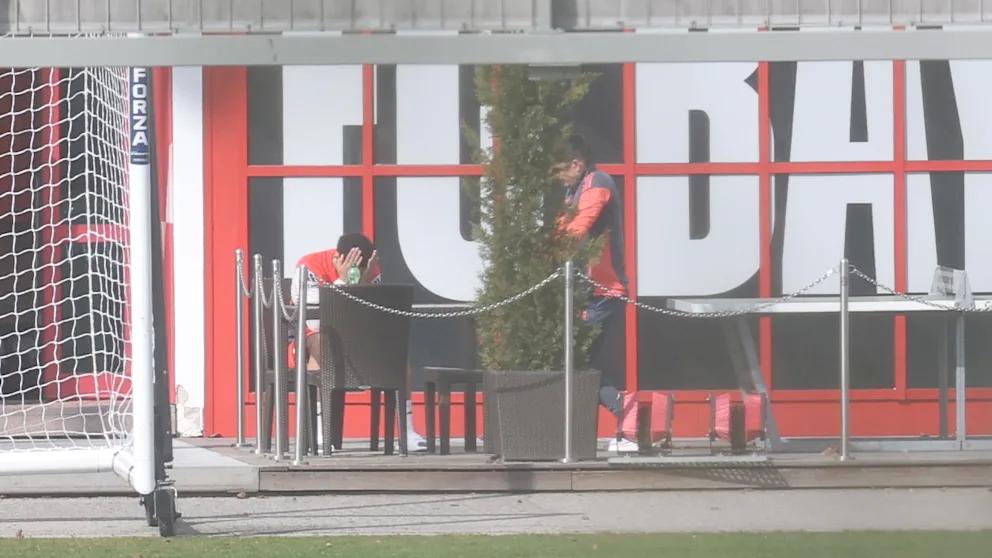 平时一向比较放松、情绪也不错的穆西亚拉,这次看上去格外严肃。交谈过程中,他还突然用双手捂住了脸。大约20分钟后,马丁内洛起身,拍了拍穆西亚拉的肩膀,随后返回球员区域。之后,穆西亚拉拿起手机,独自在露台坐到了10点52分,随后也回到了室内。
