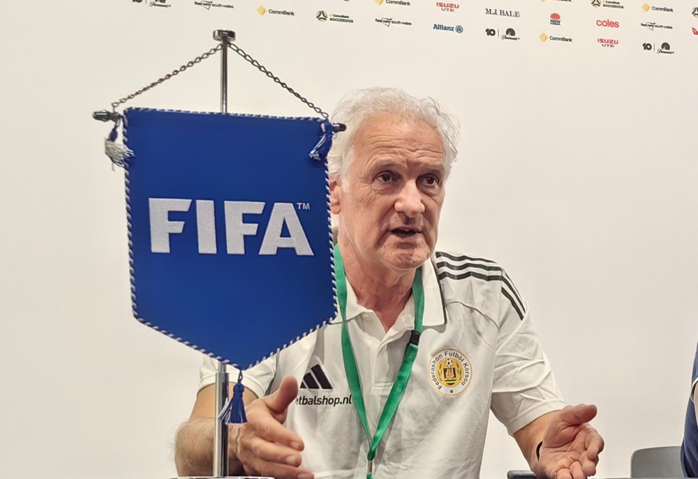 北京时间3月26日,国际足联系列赛库拉索队赛前新闻发布会在悉尼的澳大利亚体育场进行。库拉索队主教练弗雷德-吕滕携队员莱安德罗-巴库纳出席。