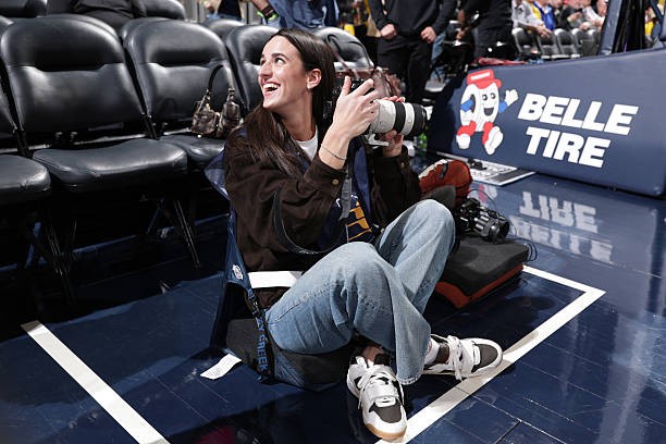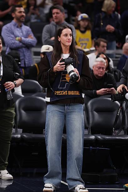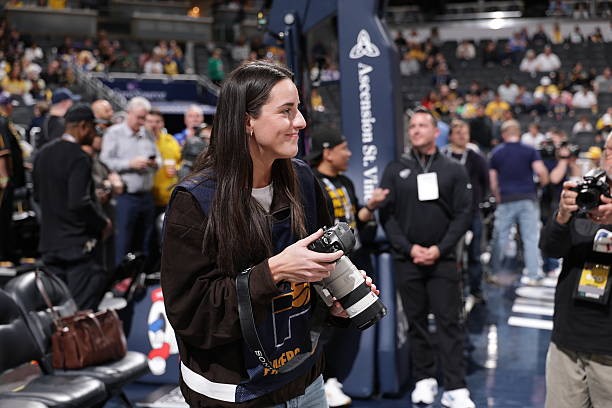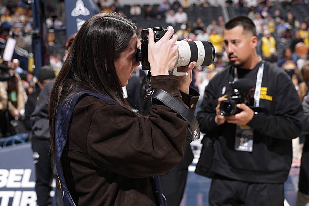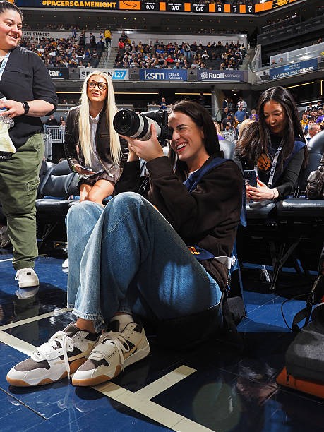 本场比赛,WNBA印第安纳狂热球星克拉克现场观赛,并担任场边摄影记者,她身着摄影记者马甲,手持搭配G大师70-200的索尼相机在场边摄影区进行拍摄。