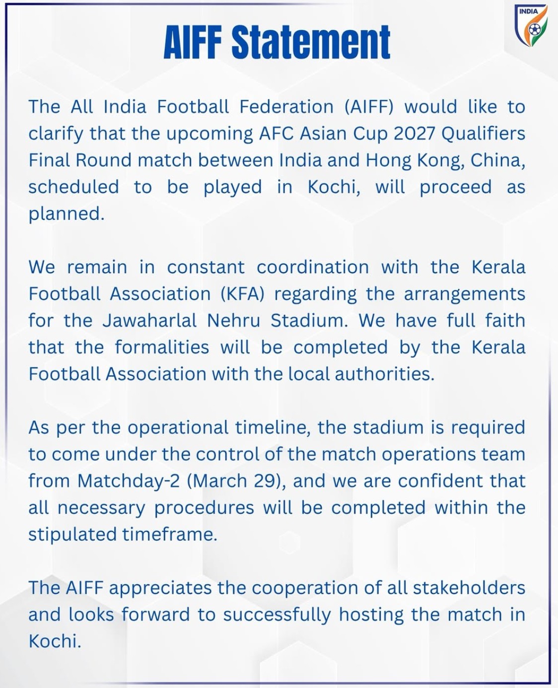 印度足协随后发表声明表示,周二的比赛仍应按原计划进行,并在社交平台上写道:“我们完全相信喀拉拉邦足协将尽快与当地政府完成相关手续。”