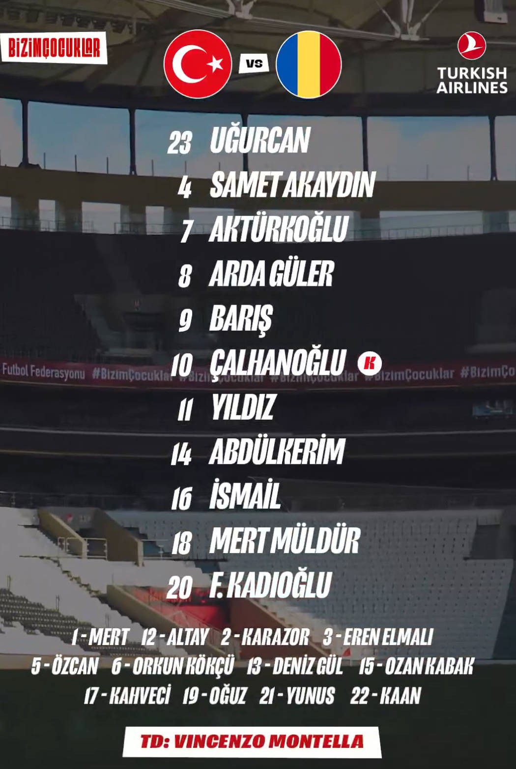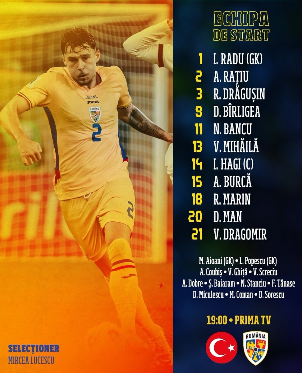 北京时间3月27日凌晨01:00,世界杯欧洲区预选赛附加赛半决赛首回合,土耳其将迎战罗马尼亚,赛前,双方的首发阵容已经公布。