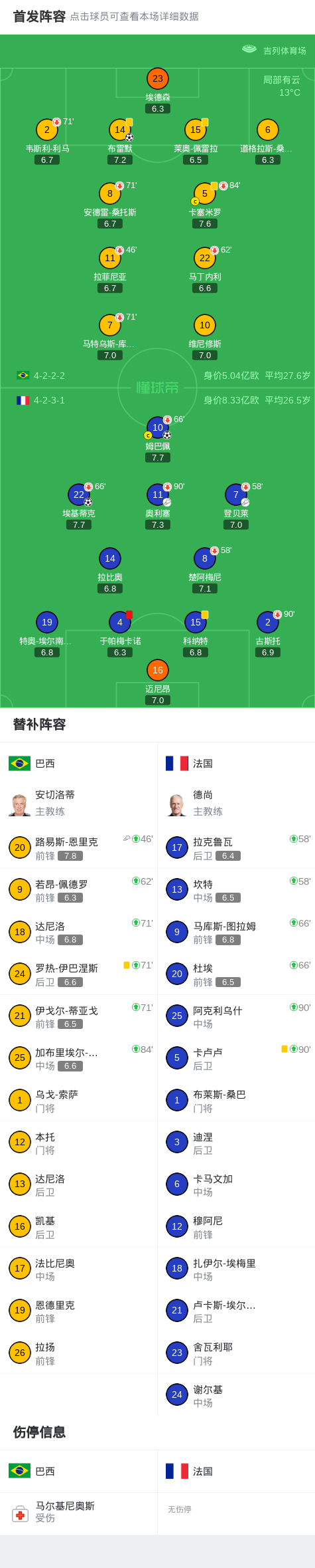 第79分钟,布雷默包抄破门,帮助巴西扳回一球,巴西1-2法国