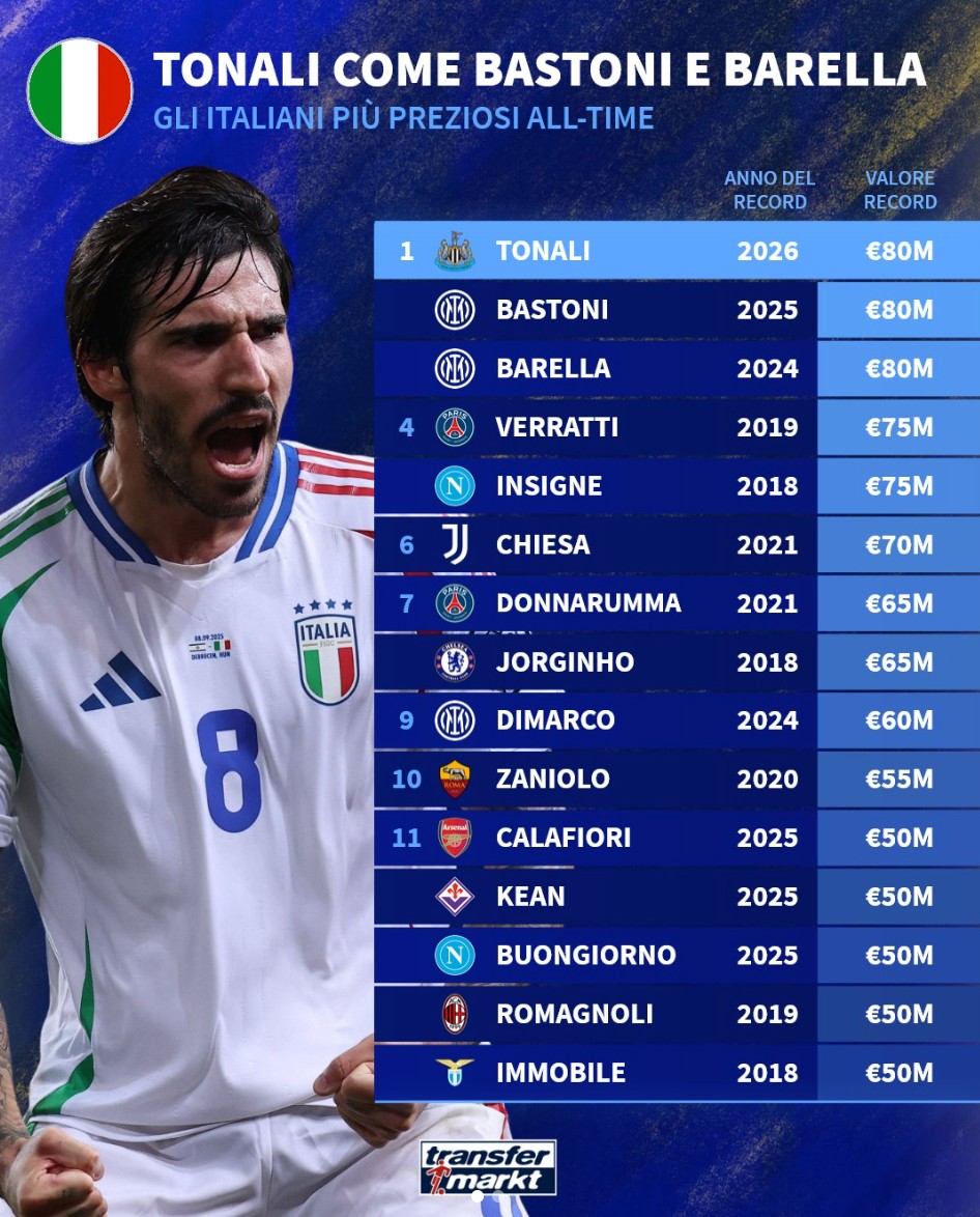 1. 托纳利 2026年(纽卡斯尔联)8000万欧元