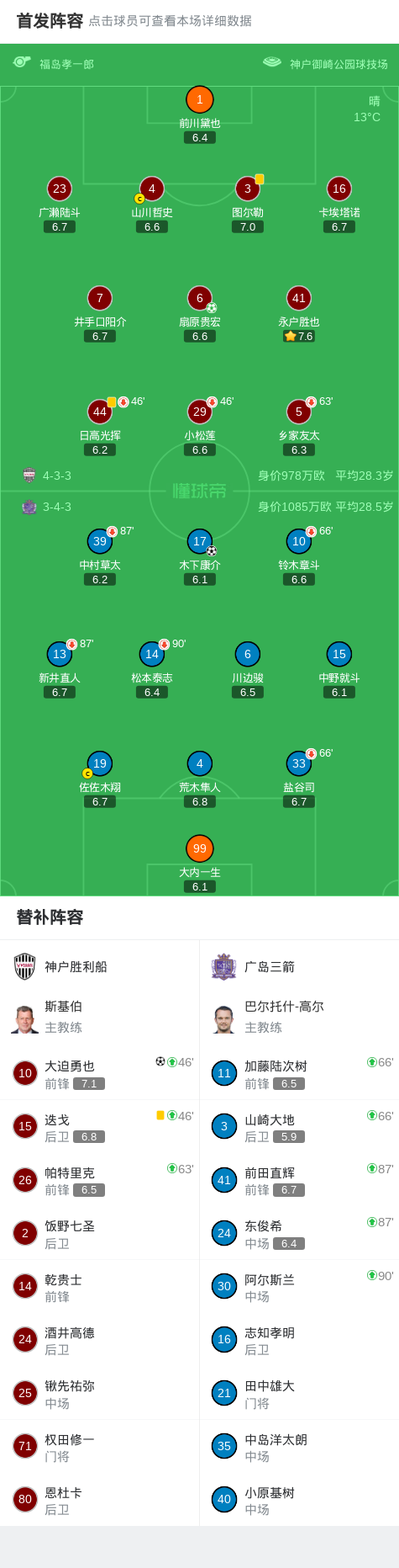 北京时间3月27日,日本职业联赛J1西区第5轮,神户胜利船主场对阵广岛三箭。比赛中,木下康介补射打破僵局,扇原贵宏点射扳平比分,大迫勇也补射绝杀。最终,神户胜利船2-1逆转广岛三箭。