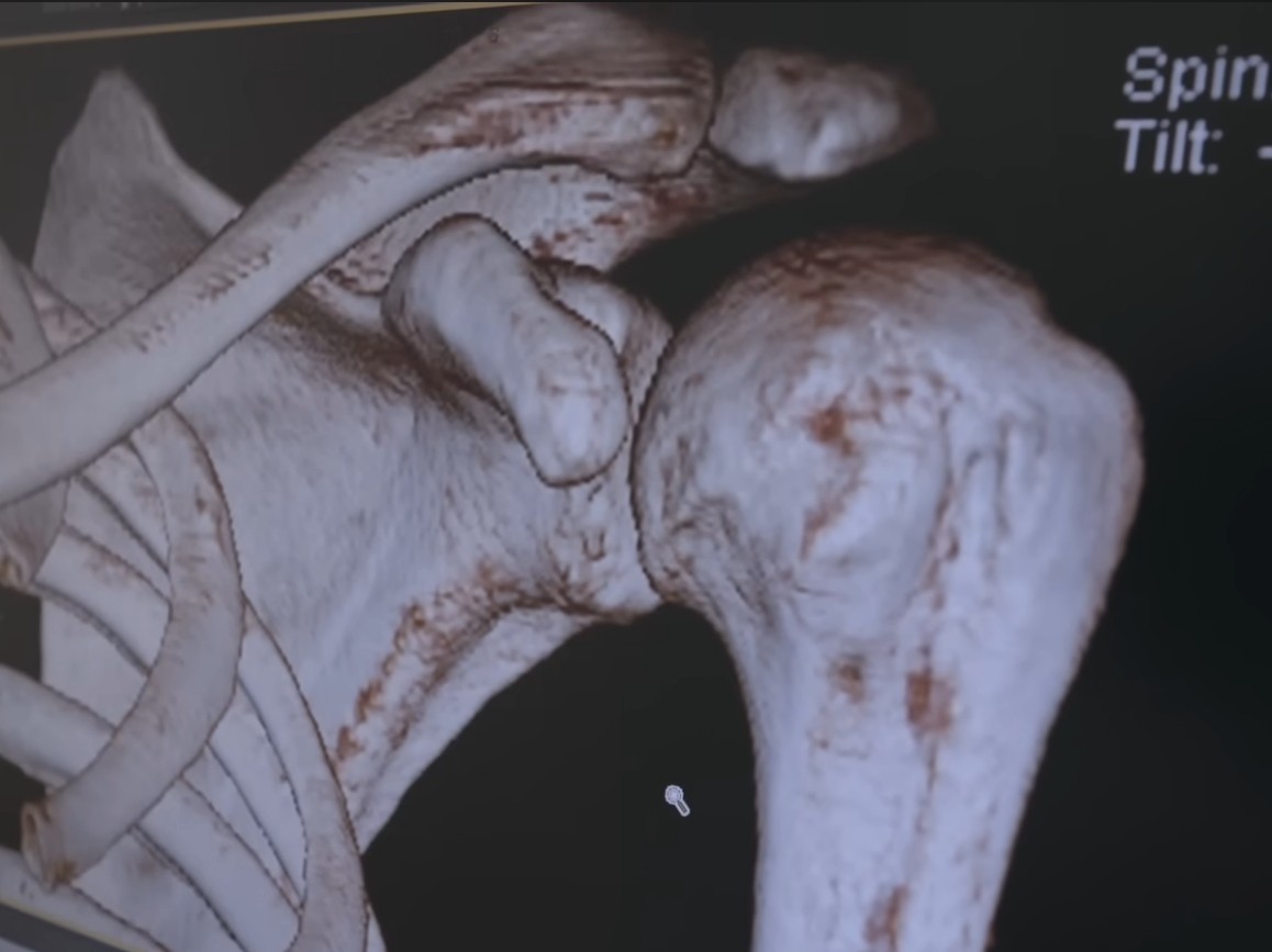 医生:当我们再次查看轴向视图时,可以看到肩膀下方这个角落的骨头有些缺损。