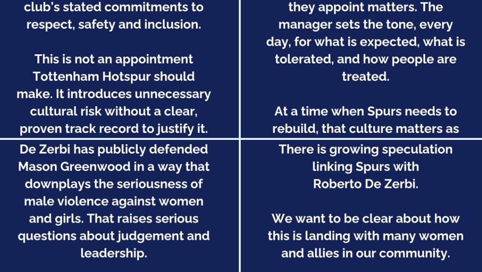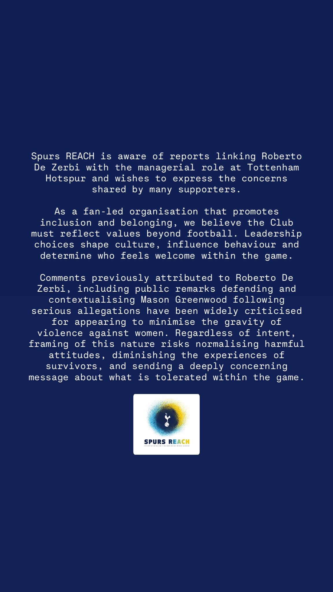 热刺同心(Spurs REACH)注意到了将罗伯托-德泽尔比与热刺主教练职位联系起来的报道,希望在此表达众多球迷共同的担忧。