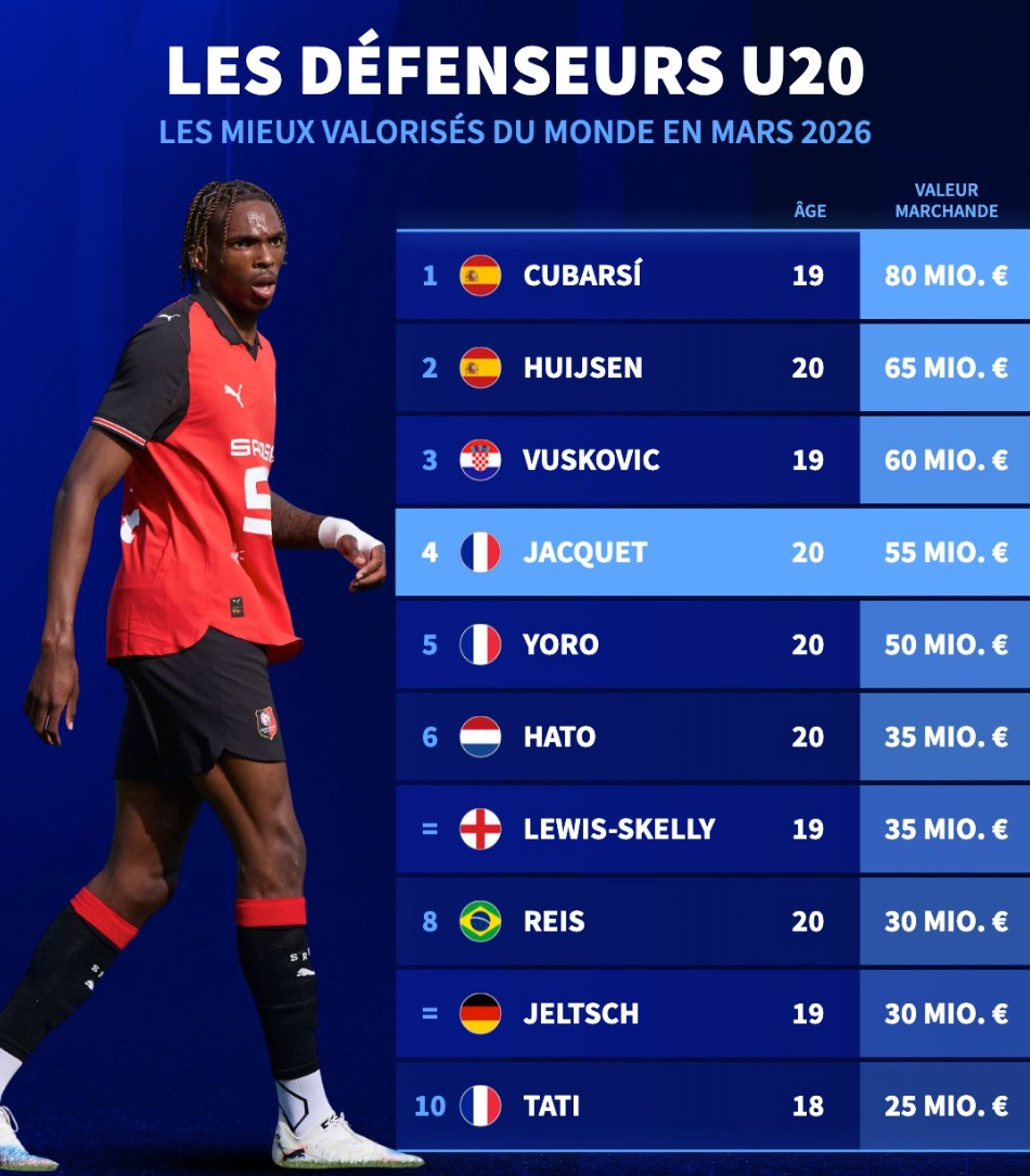北京时间3月28日,在更新了法甲球员的身价之后,德转列出了目前世界足坛身价排名前10的U20后卫,库巴西以8000万欧元高居第一,赫伊森6500万欧元第二,此次更新身价暴涨3500万欧元的杰里米-雅凯以5500万欧元排名第四。