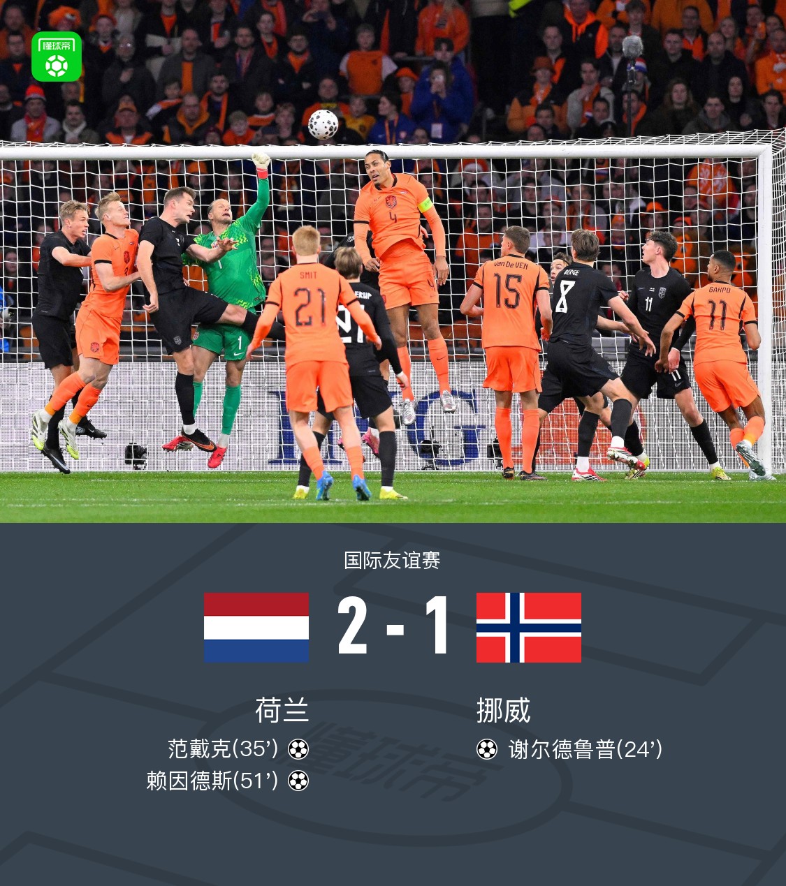 北京时间3月28日国际友谊赛,荷兰对阵挪威。谢尔德鲁普首开记录,下半场范戴克头球破门将比分扳平,赖因德斯破门将比分反超。最终比分荷兰 21 挪威。