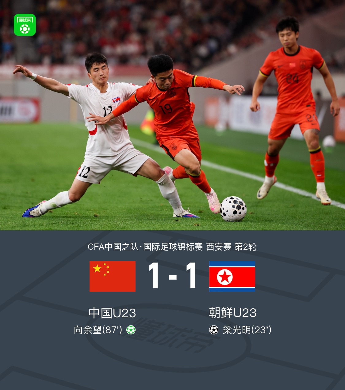 北京时间3月28日CFA中国之队·国际足球锦标赛 西安赛 第2轮,中国U23对阵朝鲜U23。中国U23向余望破门。朝鲜U23梁光明破门。最终比分中国U23 11 朝鲜U23。