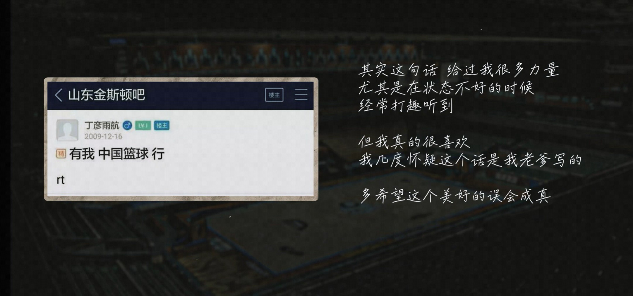这啥问题啊?这个我得给大家澄清一下,这句话真不是我说的,当时不知道谁拿我的名在百度贴吧上面注册了个账号,写了一个“有我,中国篮球行”。我为什么不正面回答问题?我承认,我也想成为这样的人,所以我一直没有回答,没有回避这个问题,我没说这个事不是我说的,算是一个美好的错误。