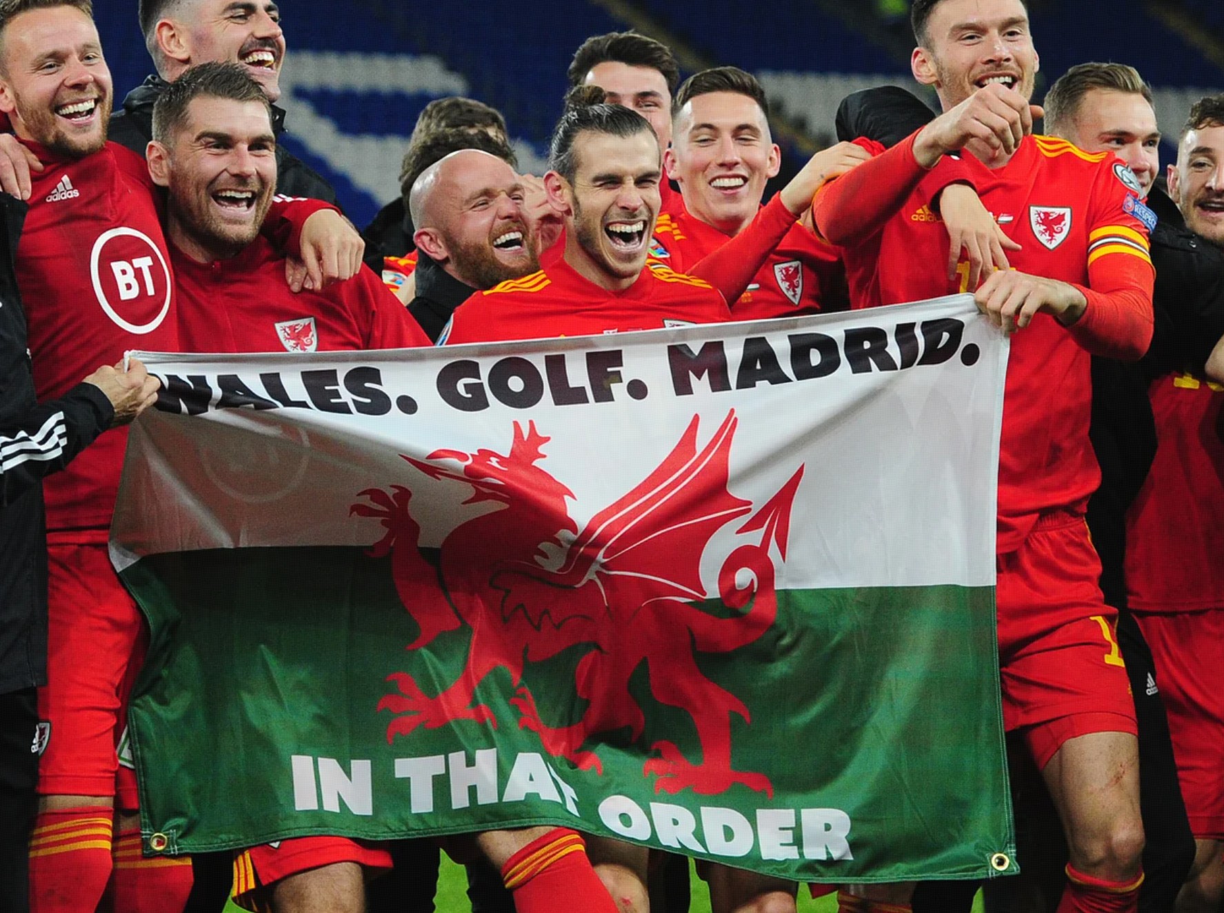 看到上面这面旗子了吗,上面写着“威尔士、高尔夫、马德里”。这相当于一个员工在公司年会上举牌说:“我家>钓鱼>公司老板。这在当时确实也引起了不小的舆论,但确实因为贝尔对高尔夫的痴迷,才有球迷制作了这样一面有趣的旗帜。