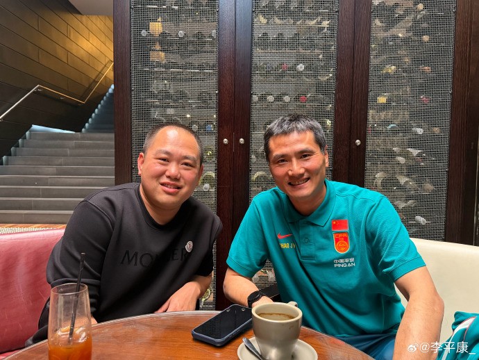李平康在社交媒体上晒出照片,他和国足主帅邵佳一在酒店大堂喝咖啡并交流。