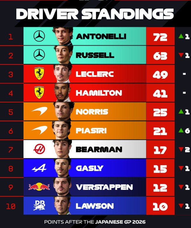 北京时间3月29日,安东内利在日本大奖赛中成功夺冠,这也是他连续两站拿到分站冠军,在本站拿到25个积分后,由于此前领跑的拉塞尔只拿到12个积分,安东内利暂时来到了车手积分榜的榜首,他也成为了史上最年轻领跑F1车手积分榜的车手。