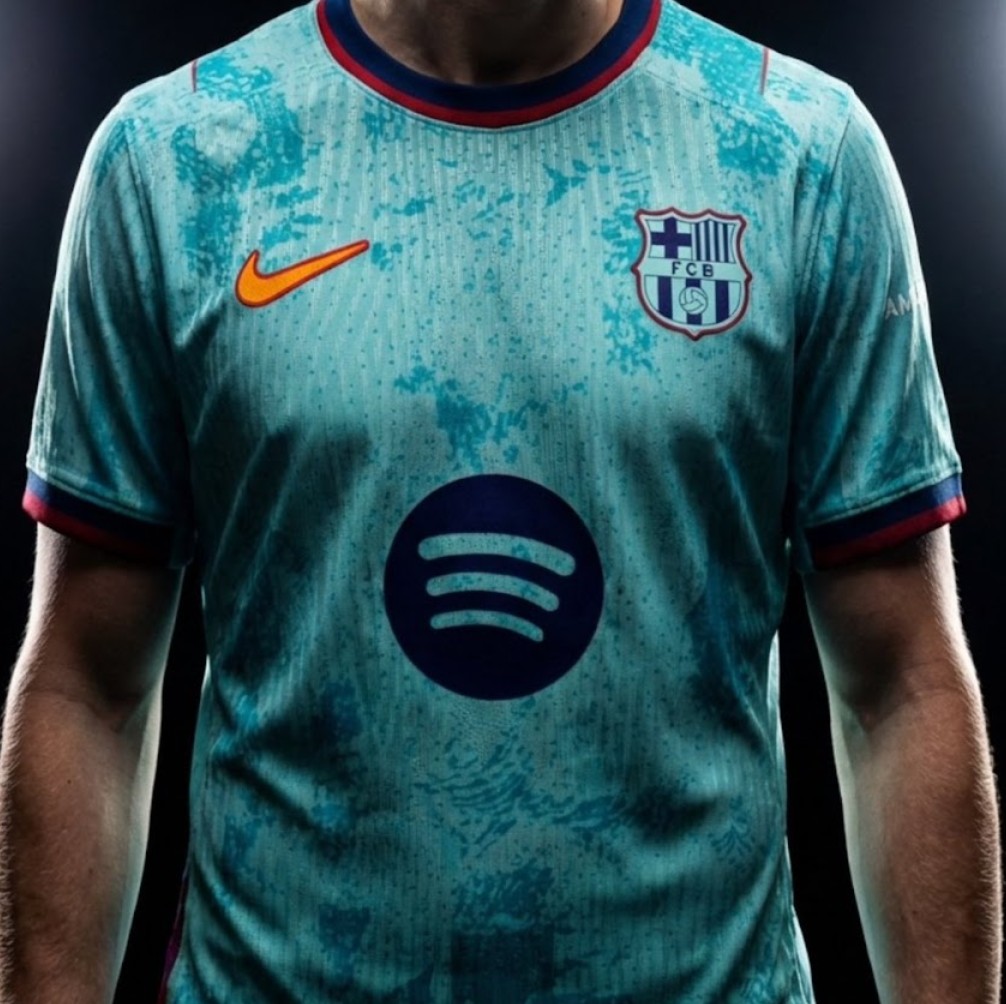巴萨新赛季第二套客场球衣整体设计大胆,以清新的薄荷绿为底色,覆盖醒目的磨损纹理图案,形成强烈视觉冲击。Nike将黄色Swoosh与橙色描边应用于球衣前部,与薄荷底色形成鲜明对比。俱乐部徽章经过重新配色,采用青绿色和藏青色单色基调,并辅以红色细节,与球衣整体美学高度契合。