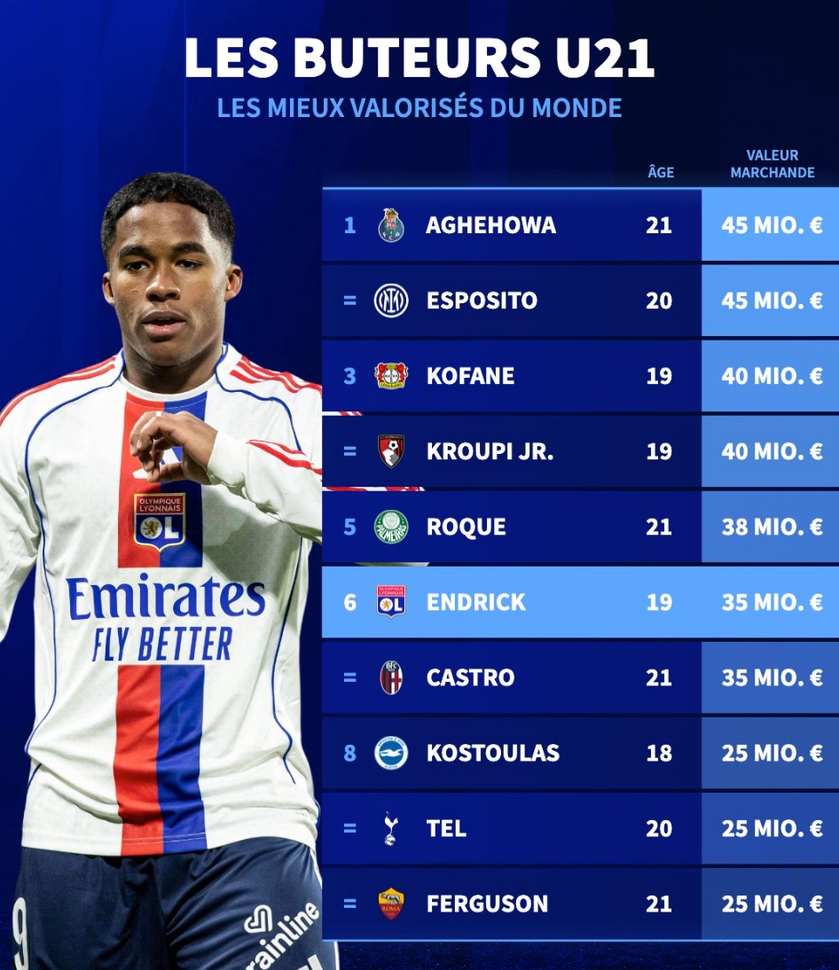 北京时间3月30日,德转列出了世界足坛身价排名前10的U21前锋,奥莫罗迪翁和皮奥-埃斯波西托同以4500万欧元并列第1,恩德里克上榜。