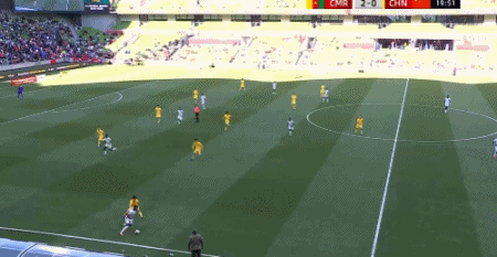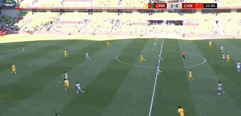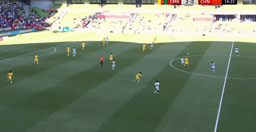第21分钟,喀麦隆后场传球再次失误,国足积极拼抢差点断球