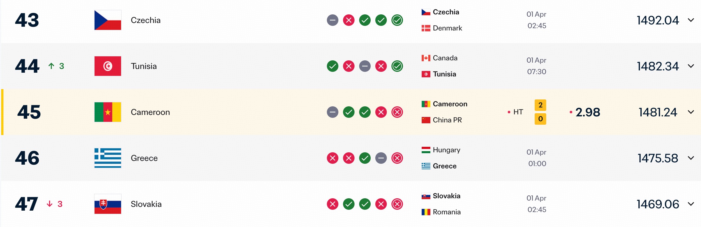 喀麦隆的实时积分则增长了2.98分,排名来到了第45位。