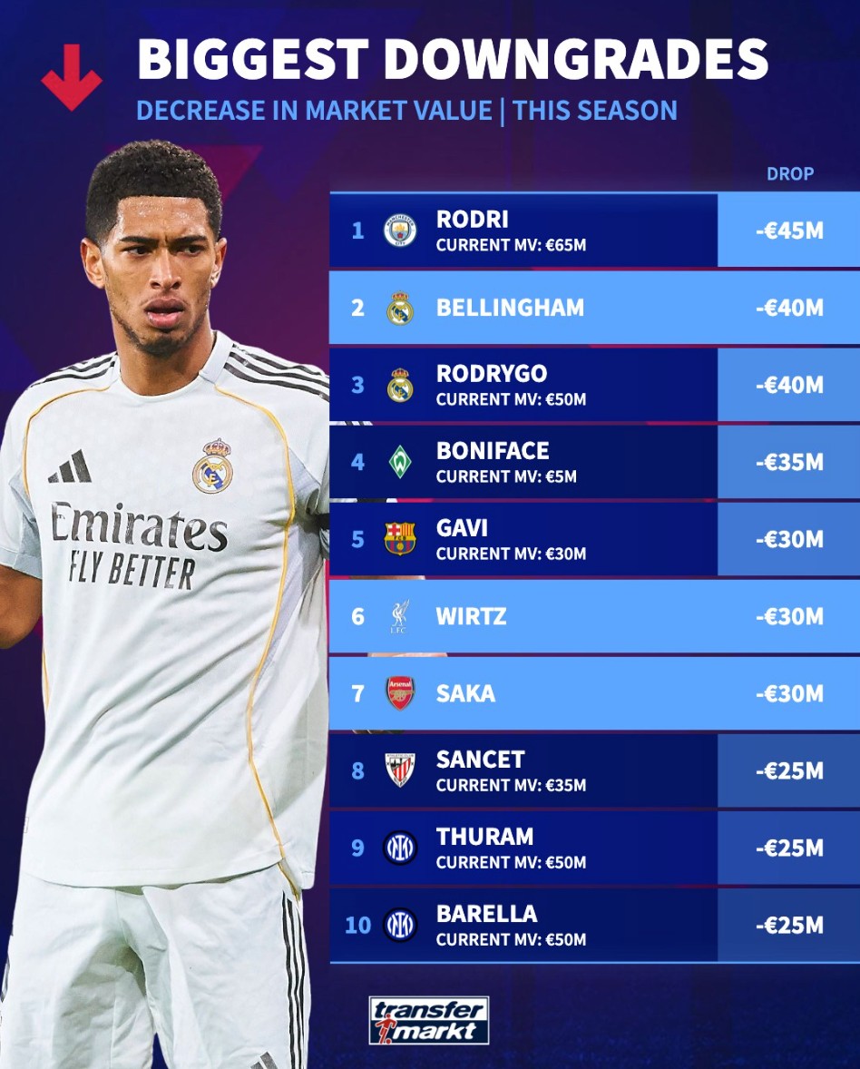 北京时间3月31日,德转列出了本赛季至今世界足坛身价跌幅最高的10名球员,罗德里下跌4500万欧元位列第一,贝林厄姆和罗德里戈下跌4000万欧元并列第二,加维、维尔茨、萨卡、马库斯-图拉姆以及巴雷拉上榜。