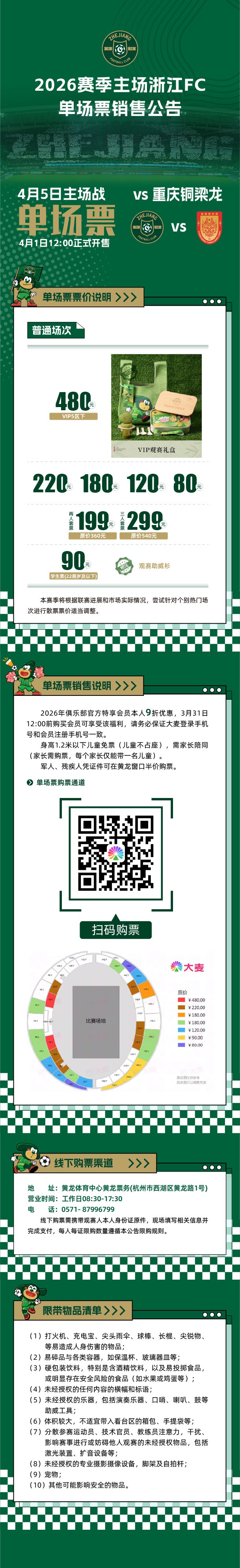 北京时间3月31日,浙江俱乐部绿城队公布了中超第四轮主场迎战重庆铜梁龙的票务公告,门票将在明天中午12点正式开售。另外,由于正值清明小长假期间,黄龙体育场东广场将继续有嘉年华活动。