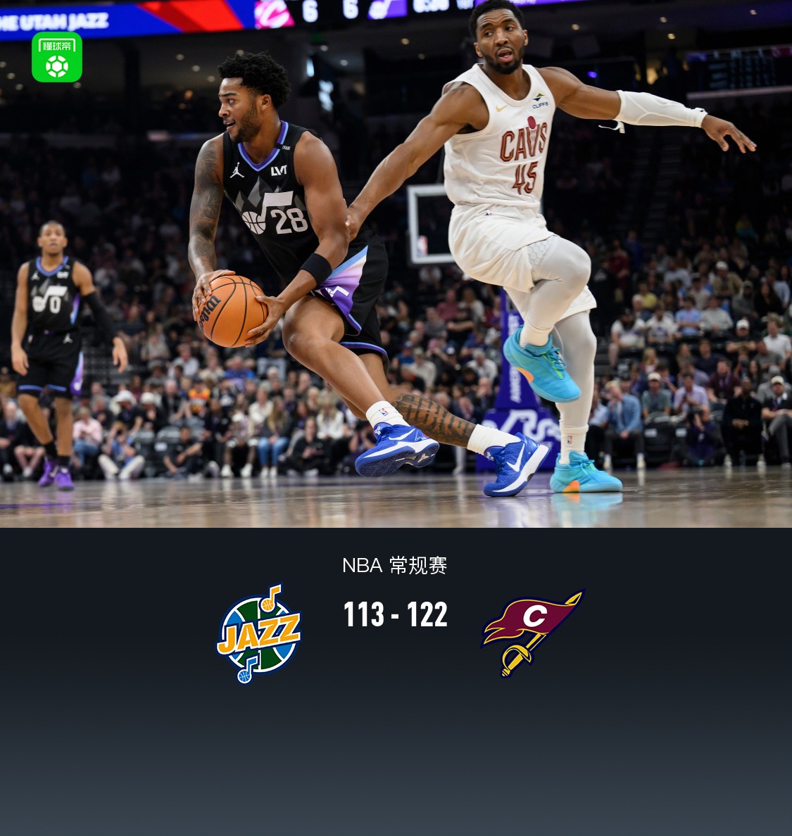第四节爵士森萨博拿下10分,骑士埃文-莫布利拿下10分,最终爵士113-122不敌骑士