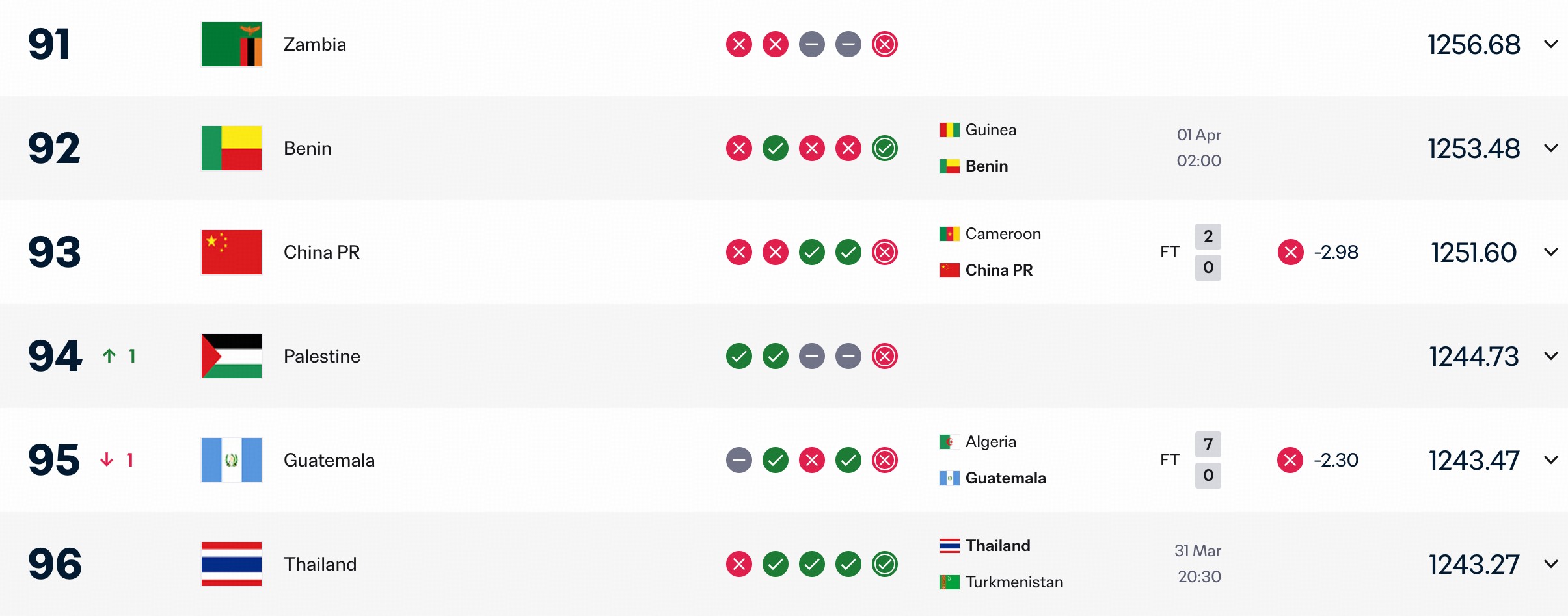 3月31日,国足在FIFA系列赛中0-2不敌喀麦隆。由于本场比赛失利国足的FIFA实时积分减少2.98分,重回第93位,上一场2-0击败库拉索之后,国足曾升到过第92位。