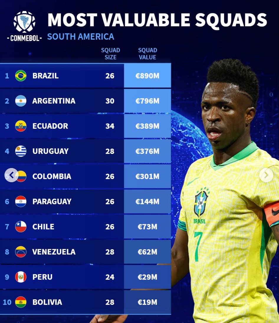 北京时间3月31日,德转列出了3月国际比赛南美洲国家队身价前10,巴西以8.9亿欧元高居第一,阿根廷7.96亿欧元第二,厄瓜多尔3.89亿欧元第三。