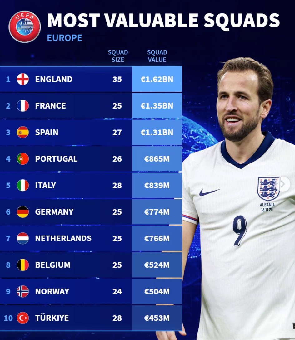 1. 英格兰 35人 16.2亿欧元