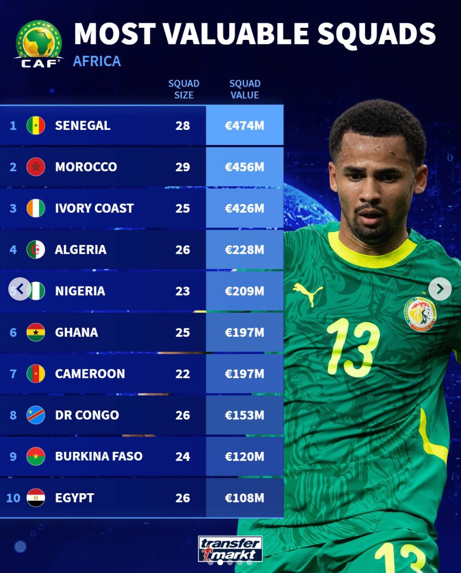 1. 塞内加尔 28人 4.74亿欧元