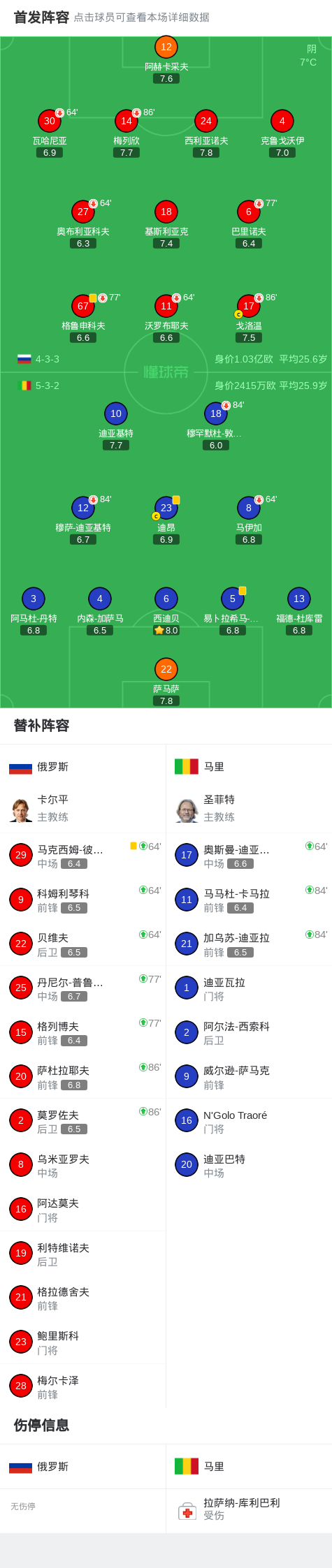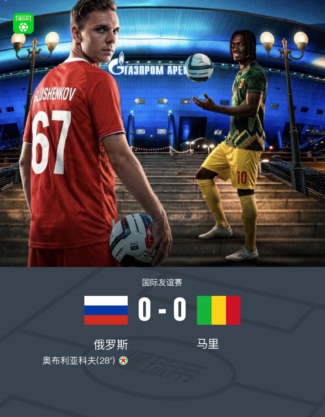 北京时间4月1日国际友谊赛,俄罗斯对阵马里。最终比分俄罗斯 0–0 马里。