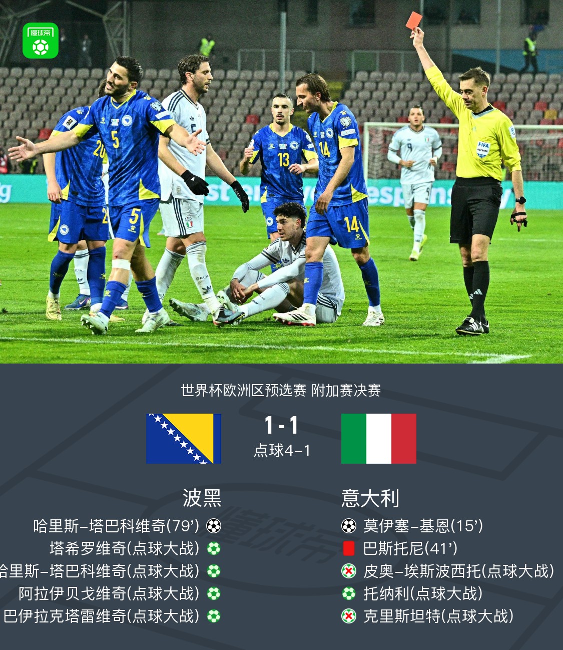 北京时间4月1日世界杯欧洲区预选赛 附加赛决赛,波黑对阵意大利。上半场,巴雷拉助攻,基恩破门,随后巴斯托尼直红下场。下半场尾声阶段,塔巴科维奇头球扳平比分。点球大战中,小将皮奥、克里斯坦特相继罚丢点球。最终比分波黑 5–2 意大利晋级世界杯。