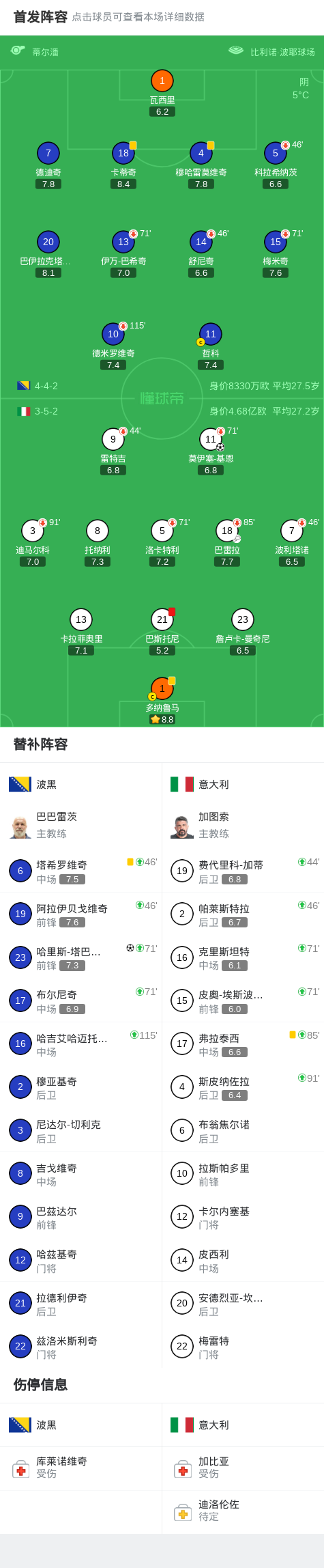 第66分钟,波黑完成20脚射门,射门数20-3领先意大利