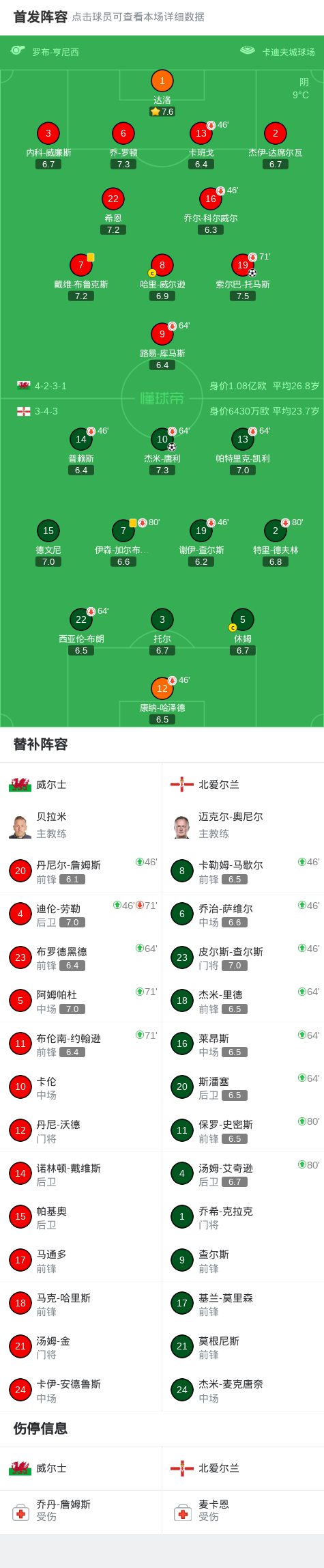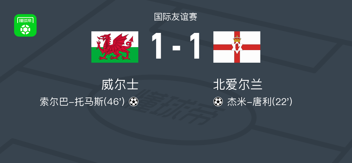 北京时间4月1日国际友谊赛,威尔士对阵北爱尔兰。威尔士索尔巴-托马斯破门。北爱尔兰杰米-唐利破门。最终比分威尔士 1–1 北爱尔兰。