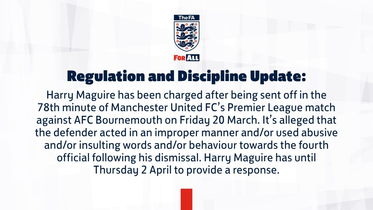北京时间4月1日,英足总官方发布公告,曼联球员马奎尔因在3月20日曼联对阵伯恩茅斯的英超比赛第78分钟被罚下后,对第四官员存在不当行为,已被正式提起指控。