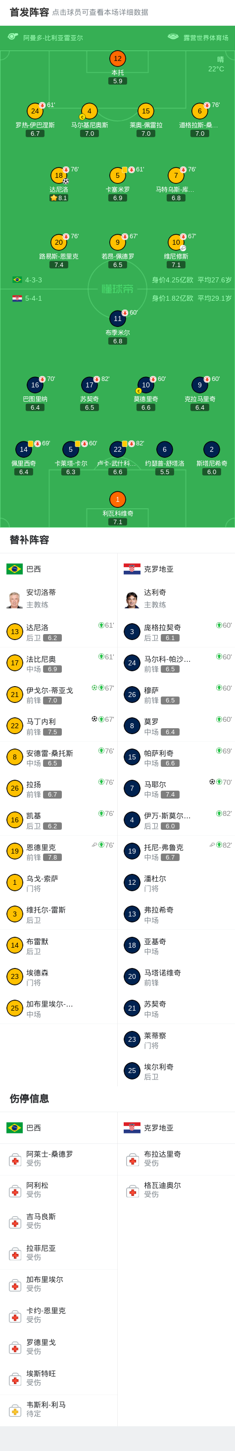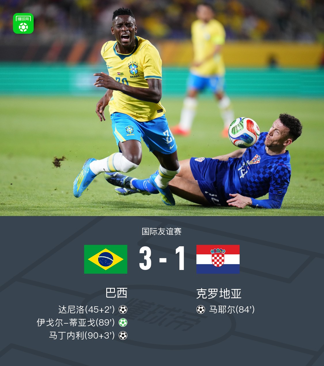 北京时间4月1日国际友谊赛,巴西对阵克罗地亚。巴西达尼洛破门,马丁内利破门,伊戈尔-蒂亚戈破门。克罗地亚马耶尔破门。最终比分巴西 3–1 克罗地亚。