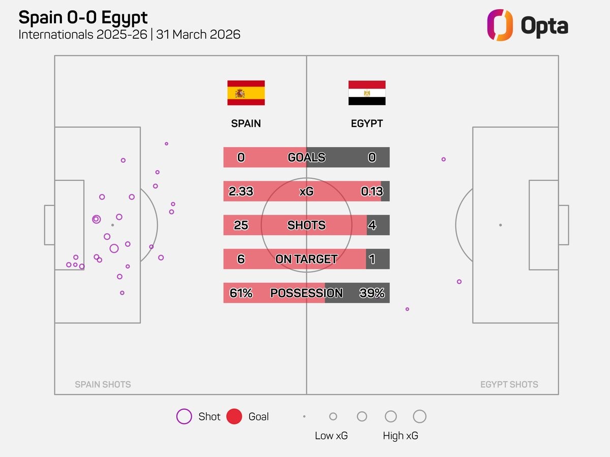 在一场国际友谊赛中,西班牙队0-0战平埃及队,本场比赛西班牙队完成了25次射门,但未能转化为进球。