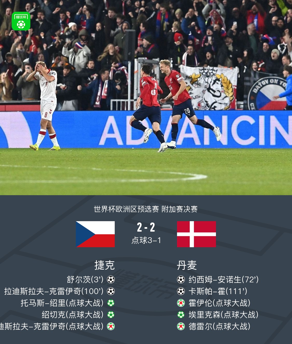 北京时间4月1日世界杯欧洲区预选赛 附加赛决赛,捷克对阵丹麦。捷克舒尔茨破门,拉迪斯拉夫-克雷伊奇破门。丹麦约西姆-安诺生破门,卡斯帕-霍破门。最终比分捷克 53 丹麦。