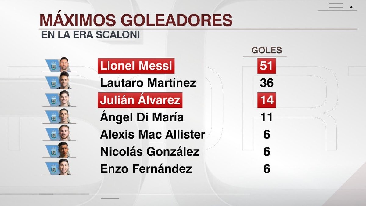 赛后根据统计,算上本场比赛的进球,梅西和胡利安-阿尔瓦雷斯分别以51球和14球位列斯卡洛尼治下阿根廷队的第一和第三射手。