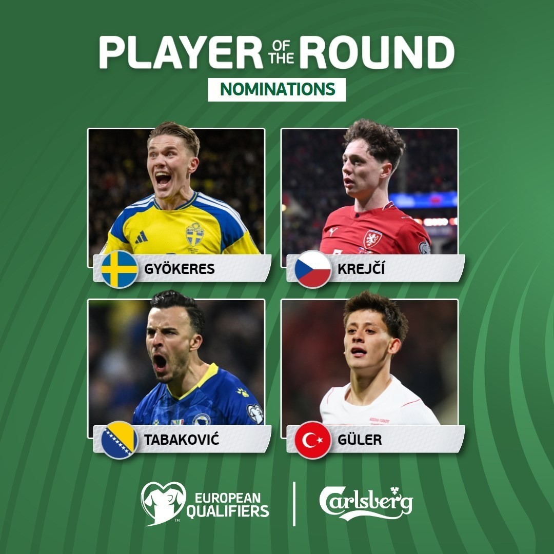 北京时间4月1日,世预赛欧洲区附加赛的四场决赛全部结束,瑞典、捷克、波黑以及土耳其分别获得了2026年美加墨世界杯决赛圈的参赛资格,与此同时欧足联官方也列出了本轮世预赛最佳球员的四位候选者。